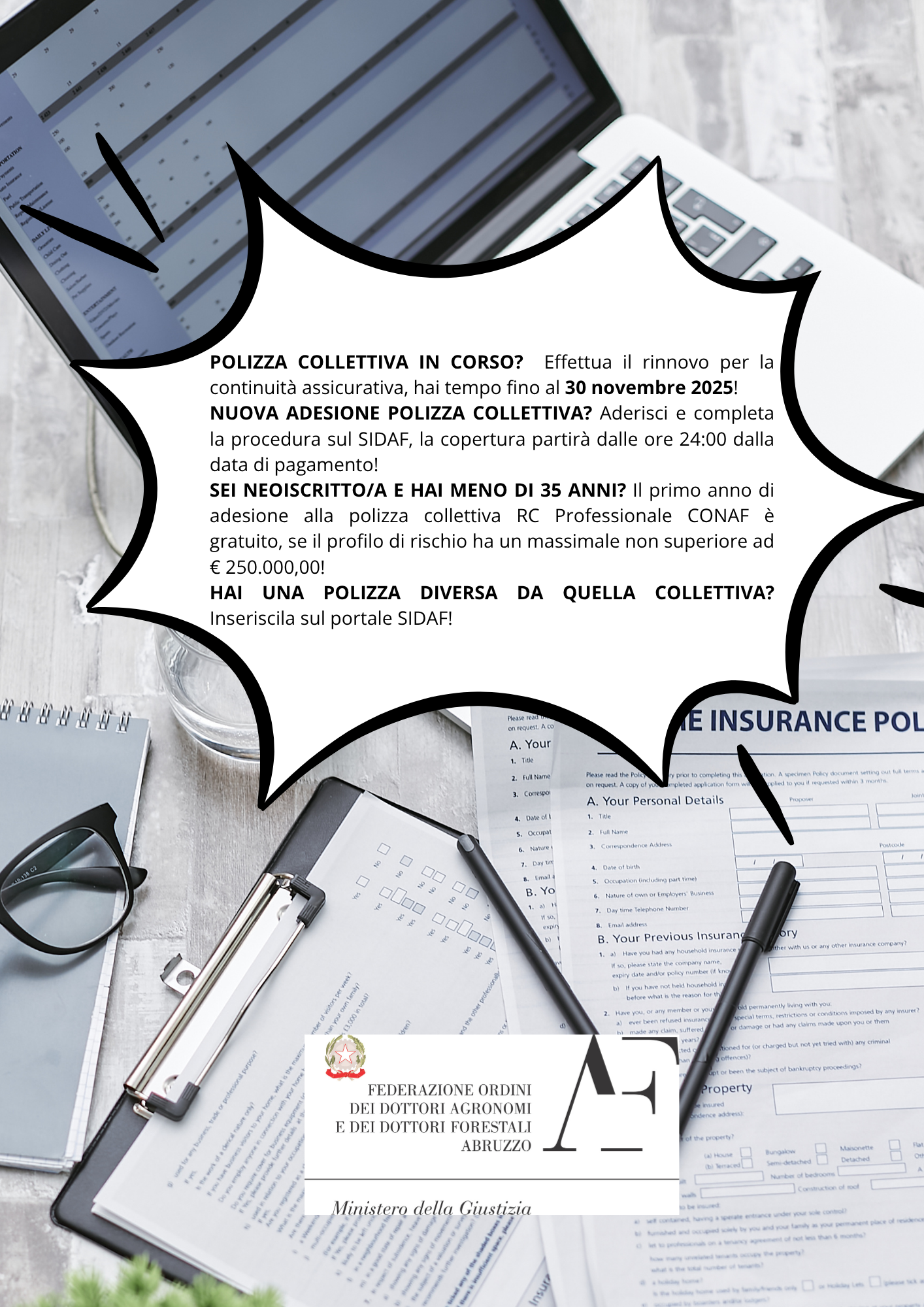 - Polizza collettiva ad adesione per la copertura dei rischi professionali contratta dal CONAF con la società XL INSURANCE COMPANY SE per il periodo 14/10/2025 – 14/10/2026: avvio delle proposte di adesione.